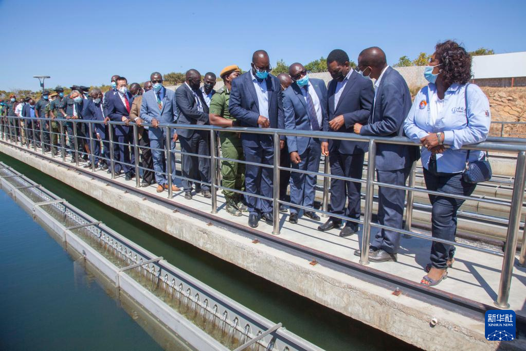 29日、カフエ川給水プロジェクトを視察するヒチレマ大統領(右から3人目)。(カフエ=新華社配信)