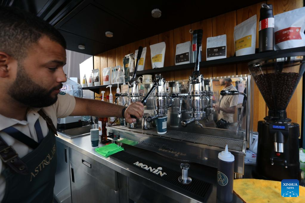 25日、ヨルダン・アンマンのフェス会場で来場者のコーヒーを用意するバリスタ。(アンマン=新華社配信)