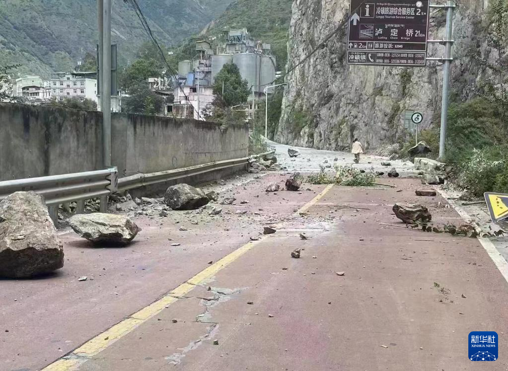 5日、四川省カンゼ・チベット族自治州瀘定県冷磧鎮付近の道路に落ちた岩。(瀘定=新華社配信)