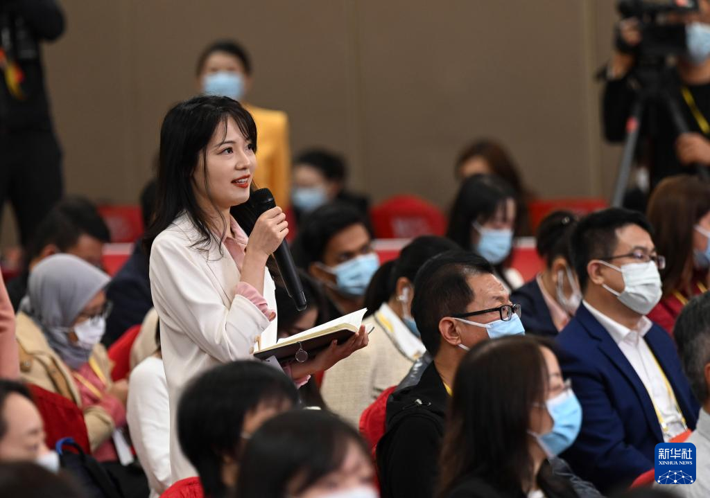 中国共産党第20回全国代表大会(党大会)は21日、北京のメディアセンターで記者会見を開いた。中国生態環境部党組メンバーで副部長の翟青(たく・せい)氏が「人と自然が調和し共生する美しい中国の建設」というテーマを巡って記者の質問に答えた。写真は記者会見のサブ会場で質問する記者。(北京=新華社記者/金良快)