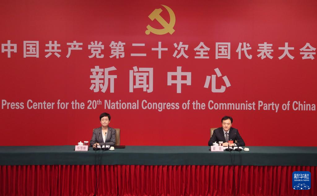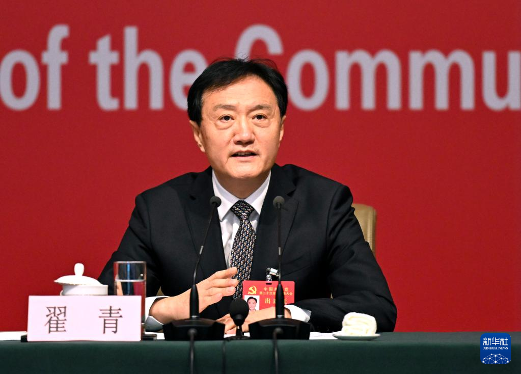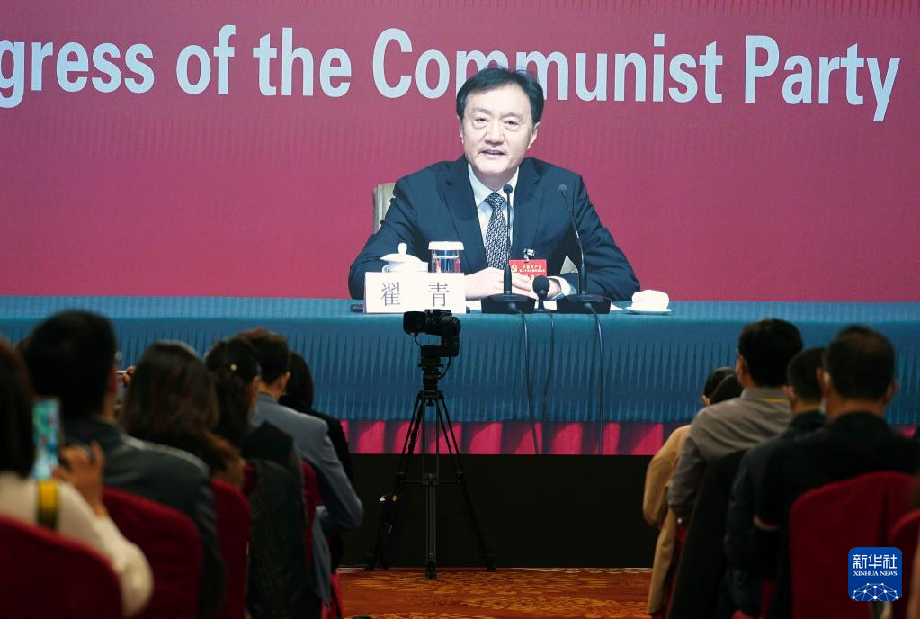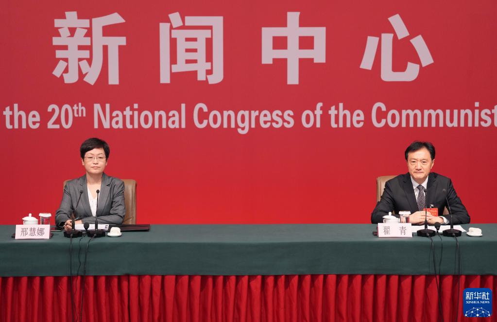 中国共産党第20回全国代表大会(党大会)は21日、北京のメディアセンターで記者会見を開いた。中国生態環境部党組メンバーで副部長の翟青(たく・せい)氏が「人と自然が調和し共生する美しい中国の建設」というテーマを巡って記者の質問に答えた。(北京=新華社記者/賈浩成)