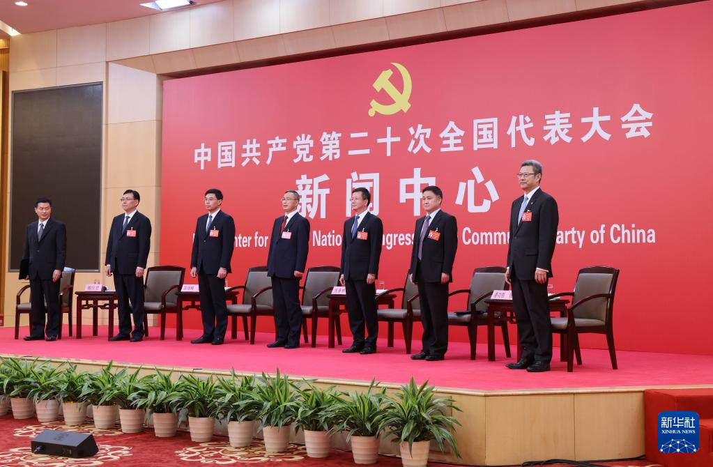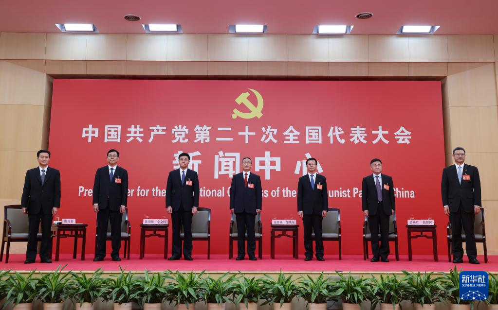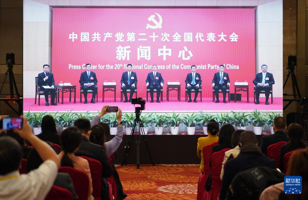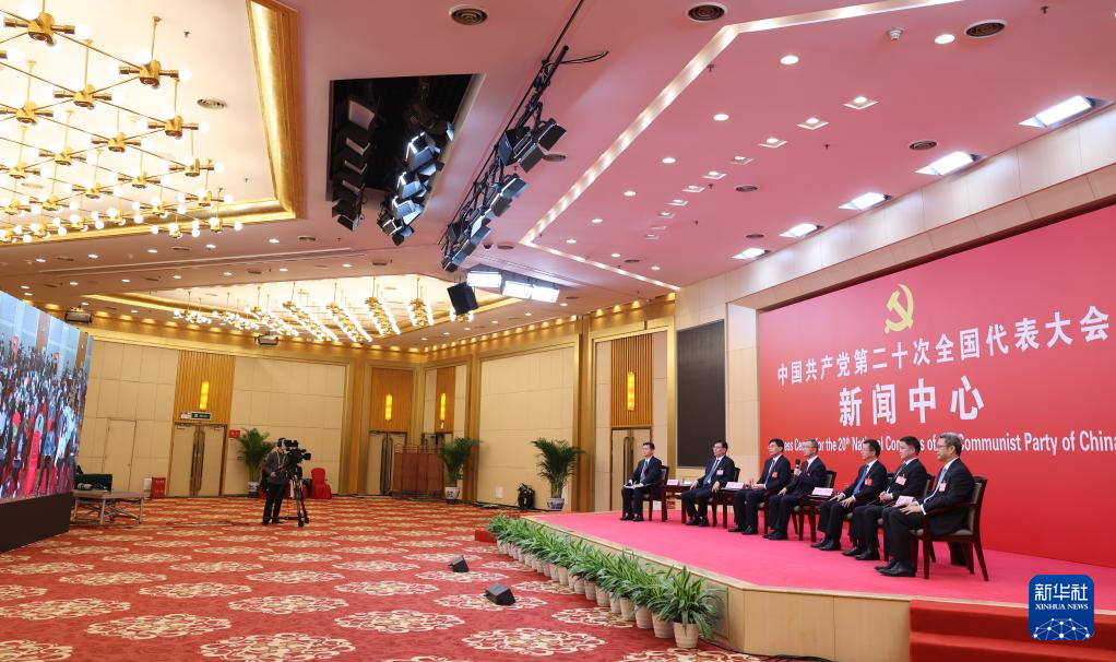 中国共産党第20回全国代表大会(党大会)のメディアセンターで20日、5回目のグループインタビューが行われた。青海省、寧夏回族自治区、新疆ウイグル自治区、中央・国家機関、中央金融機関、中央企業(在北京)の代表団報道官が出席して、各代表団の党大会報告の学習・討議状況を説明し、記者の質問に答えた。(北京=新華社記者/李明)
