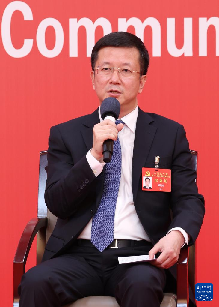 中国共産党第20回全国代表大会(党大会)のメディアセンターで20日、5回目のグループインタビューが行われた。青海省、寧夏回族自治区、新疆ウイグル自治区、中央・国家機関、中央金融機関、中央企業(在北京)の代表団報道官が出席して、各代表団の党大会報告の学習・討議状況を説明し、記者の質問に答えた。写真はグループインタビューで記者の質問に答える、中央・国家機関工作委員会副書記の鄒暁東(すう・ぎょうとう)氏。(北京=新華社記者/張玉薇)