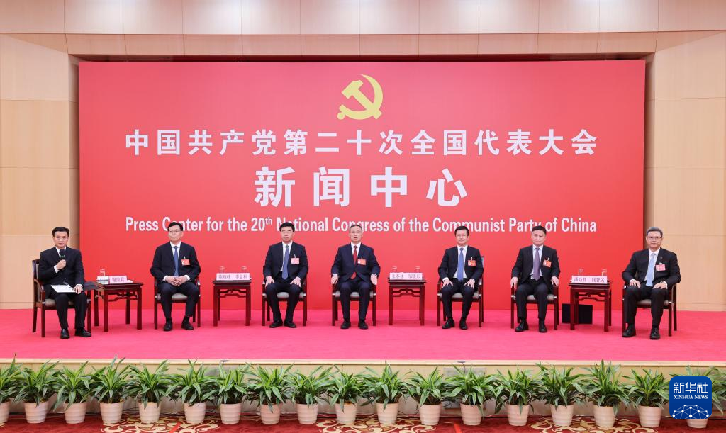 中国共産党第20回全国代表大会(党大会)のメディアセンターで20日、5回目のグループインタビューが行われた。青海省、寧夏回族自治区、新疆ウイグル自治区、中央・国家機関、中央金融機関、中央企業(在北京)の代表団報道官が出席して、各代表団の党大会報告の学習・討議状況を説明し、記者の質問に答えた。(北京=新華社記者/陳建力)