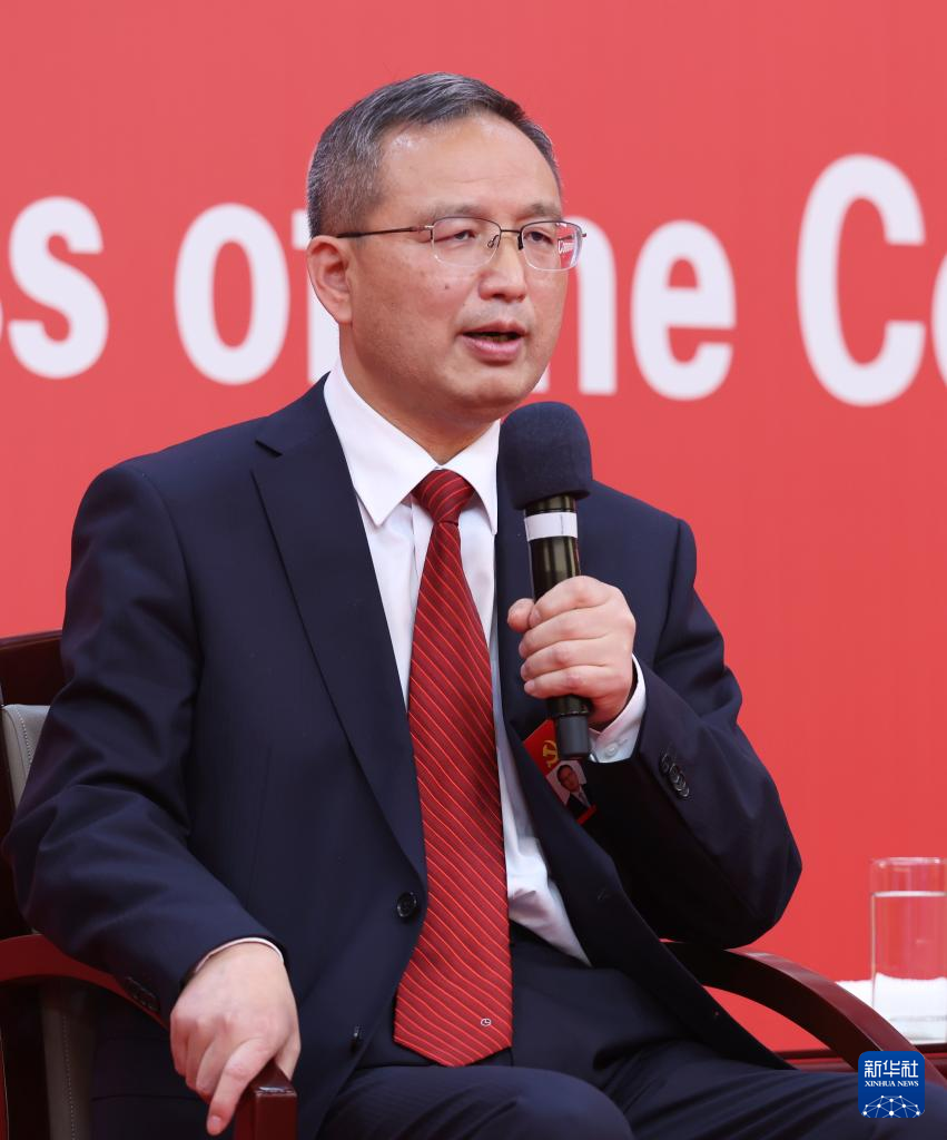 中国共産党第20回全国代表大会(党大会)のメディアセンターで20日、5回目のグループインタビューが行われた。青海省、寧夏回族自治区、新疆ウイグル自治区、中央・国家機関、中央金融機関、中央企業(在北京)の代表団報道官が出席して、各代表団の党大会報告の学習・討議状況を説明し、記者の質問に答えた。写真はグループインタビューで記者の質問に答える、中国人民銀行(中央銀行)党委員会委員・副総裁で国家外貨管理局党組書記・局長の潘功勝(はん・こうしょう)氏。(北京=新華社記者/張玉薇)