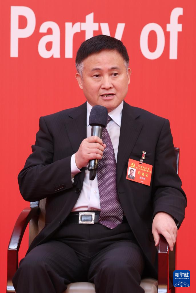 中国共産党第20回全国代表大会(党大会)のメディアセンターで20日、5回目のグループインタビューが行われた。青海省、寧夏回族自治区、新疆ウイグル自治区、中央・国家機関、中央金融機関、中央企業(在北京)の代表団報道官が出席して、各代表団の党大会報告の学習・討議状況を説明し、記者の質問に答えた。写真はグループインタビューで記者の質問に答える、中国共産党青海省委員会常務委員・西寧市委員会書記の陳瑞峰(ちん・ずいほう)氏。(北京=新華社記者/張玉薇)