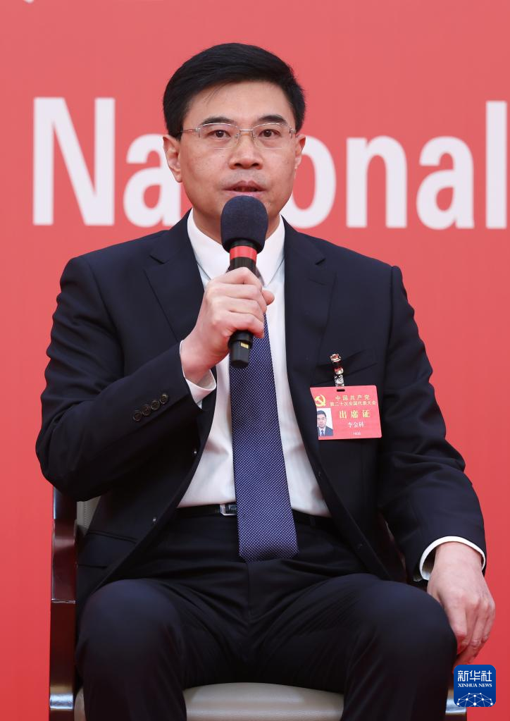 中国共産党第20回全国代表大会(党大会)のメディアセンターで20日、5回目のグループインタビューが行われた。青海省、寧夏回族自治区、新疆ウイグル自治区、中央・国家機関、中央金融機関、中央企業(在北京)の代表団報道官が出席して、各代表団の党大会報告の学習・討議状況を説明し、記者の質問に答えた。写真はグループインタビューで記者の質問に答える、中国共産党寧夏回族自治区委員会常務委員・宣伝部長の李金科(り・きんか)氏。(北京=新華社記者/陳建力)