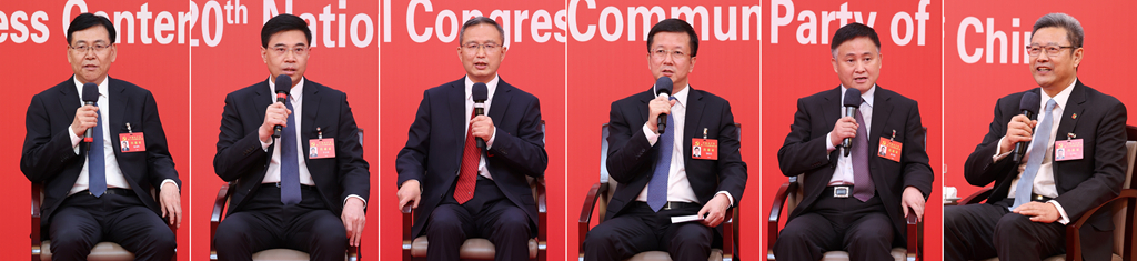 中国共産党第20回全国代表大会(党大会)のメディアセンターで20日、5回目のグループインタビューが行われた。青海省、寧夏回族自治区、新疆ウイグル自治区、中央・国家機関、中央金融機関、中央企業(在北京)の代表団報道官が出席して、各代表団の党大会報告の学習・討議状況を説明し、記者の質問に答えた。(組み合わせ写真、北京=新華社記者/張玉薇)