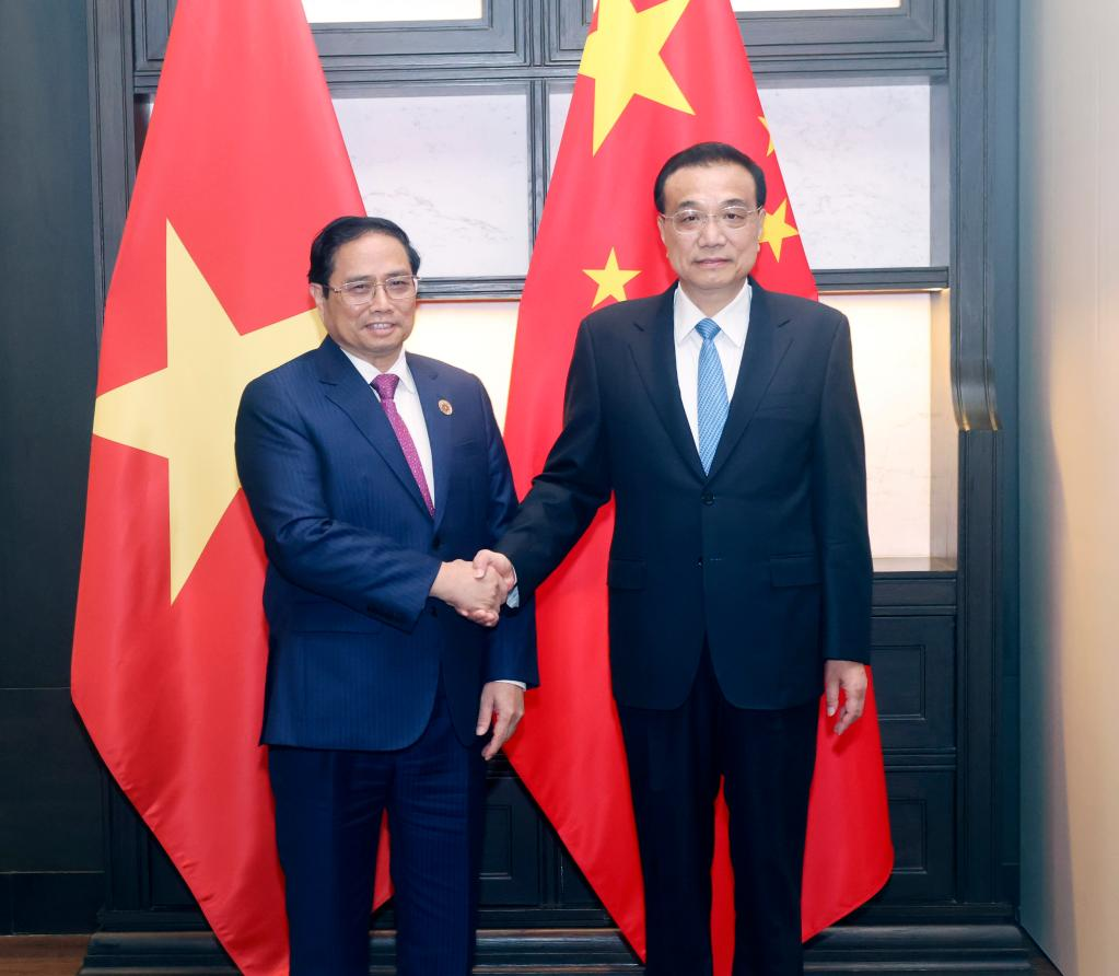 中国の李克強(り・こくきょう)国務院総理はカンボジアの首都プノンペンで11日、一連の東アジア協力首脳会議に出席するベトナムのファム・ミン・チン首相と会談した。(プノンペン=新華社記者/劉衛兵)