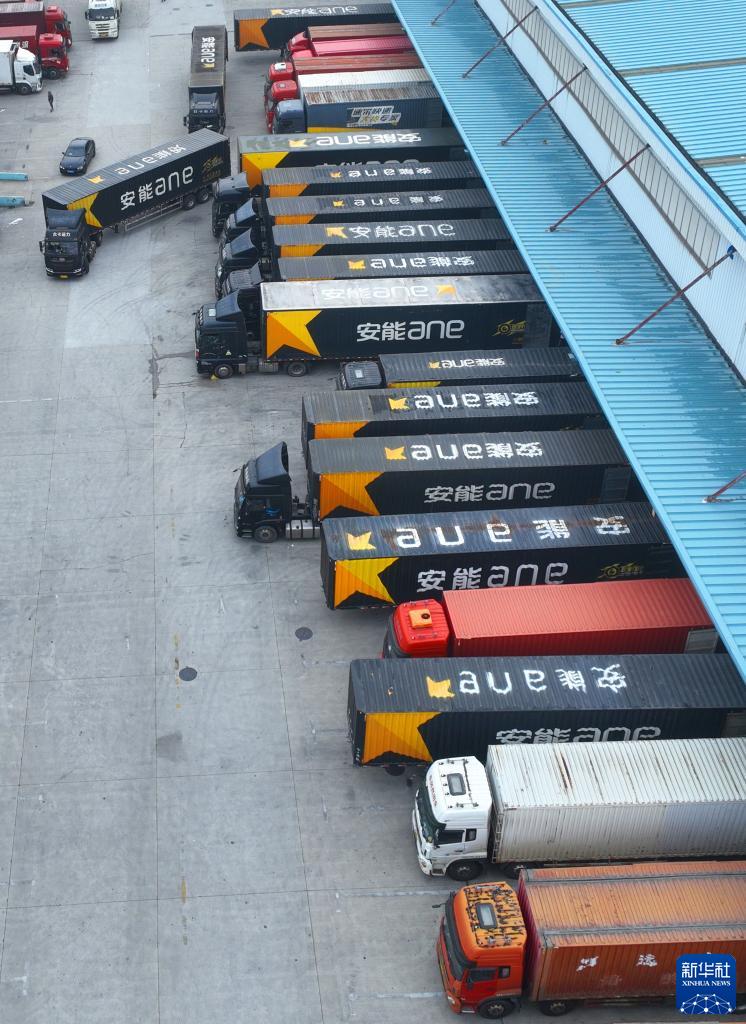 11日、江蘇省南通市崇川区の宝湾物流パークに停車する宅配物輸送車。(小型無人機から、南通=新華社配信/許叢軍)