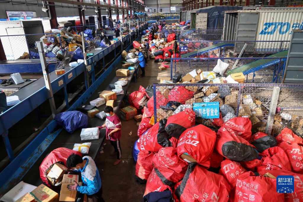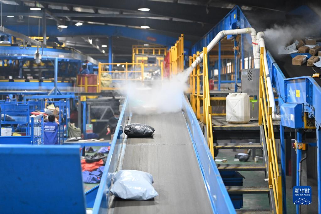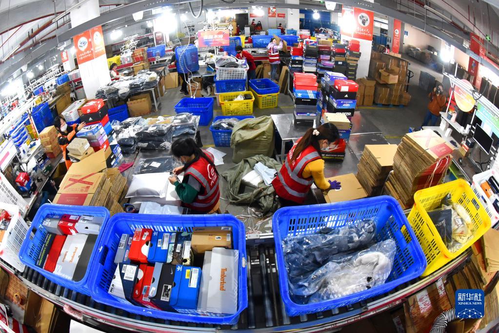 11日、山東省臨沂市蘭山経済開発区の国際陸港スマート物流パークで、宅配物を仕分ける従業員。(臨沂=新華社配信/許伝宝)