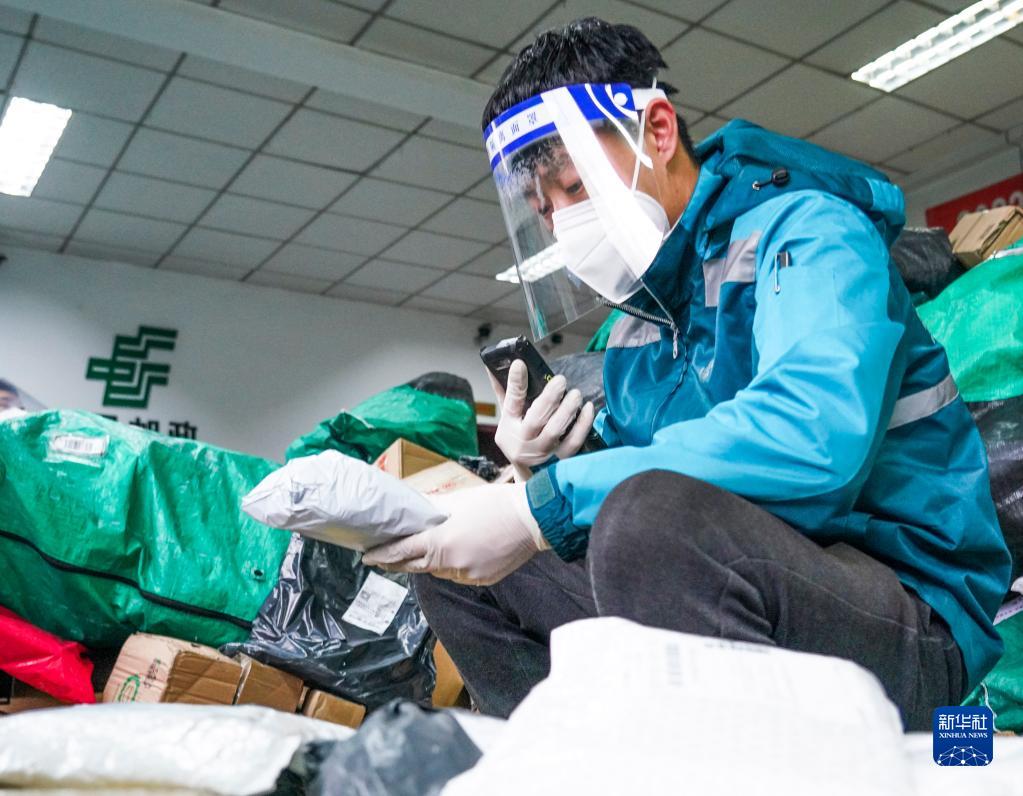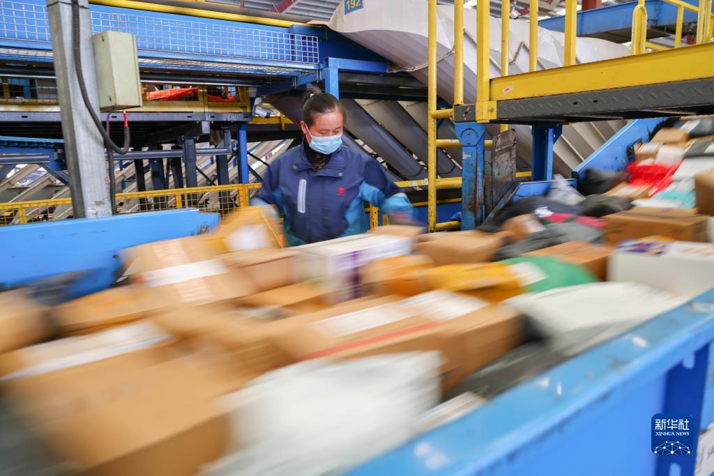 11日、山西省太原市にある宅配企業の配送センターで、宅配物を仕分ける従業員。(太原=新華社記者/楊晨光)pagebreak