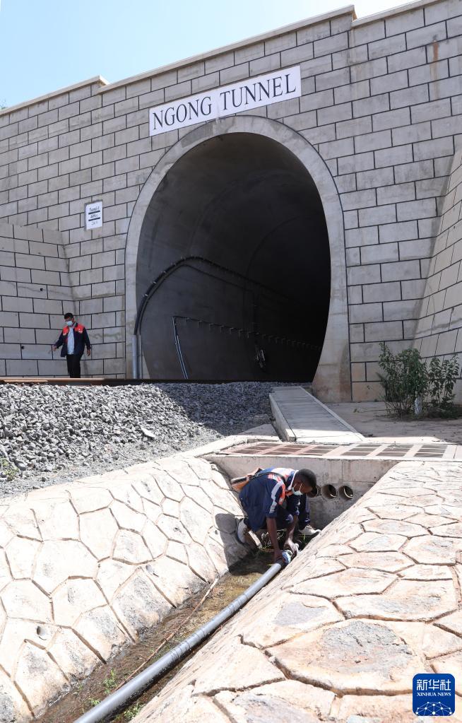 10日、ケニアのナイロビ‐マラバ鉄道のンゴングトンネル入り口で水道管の補修をする作業員。(キムカ=新華社記者/董江輝)