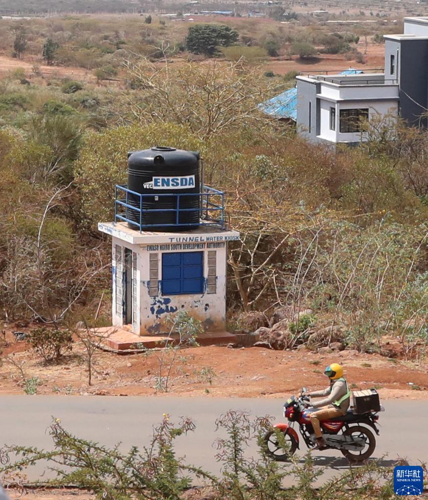 10日、ケニアのキムカで、「トンネル・ウオーター」と書かれた貯水タンクの前をオートバイで通る男性。(キムカ=新華社記者/董江輝)