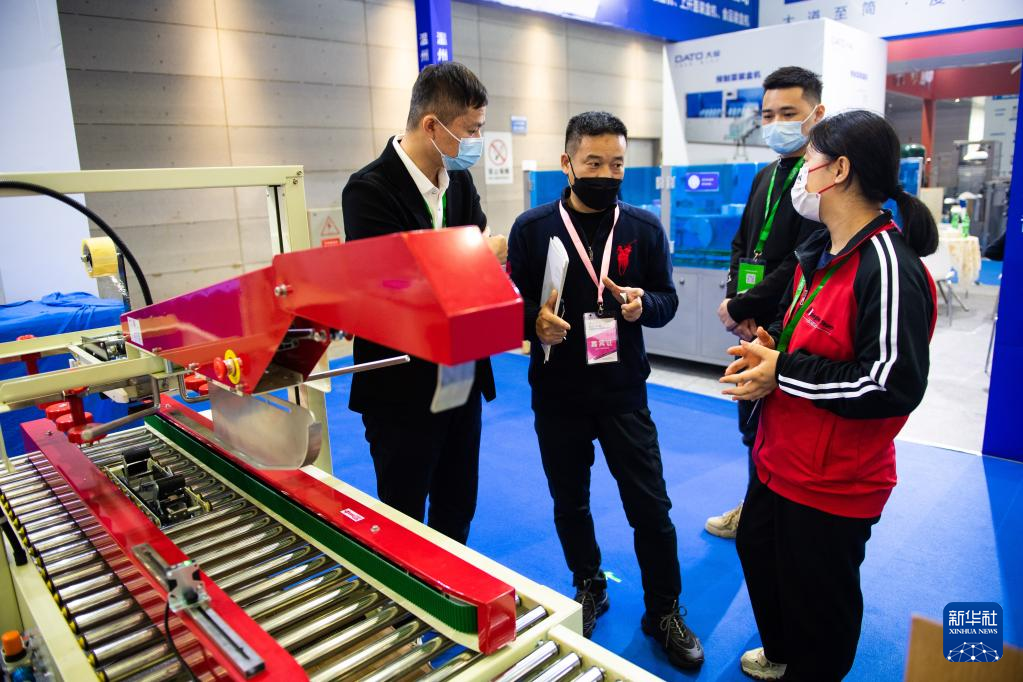 24日、食品用の包装機器について説明を受ける来場者。(長沙=新華社記者/陳思汗)pagebreak