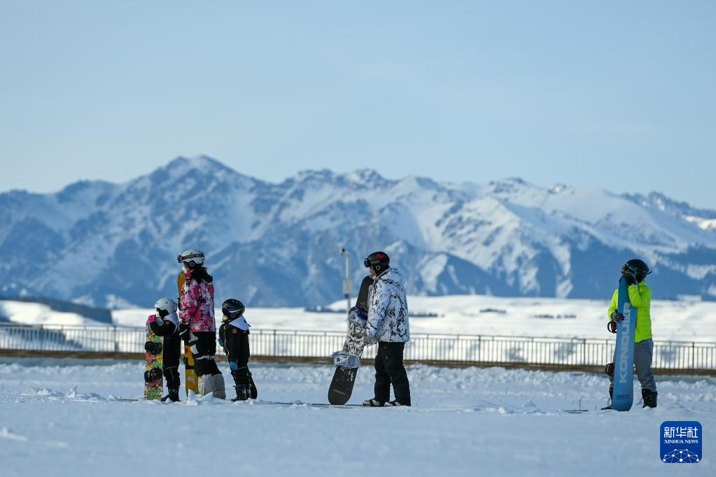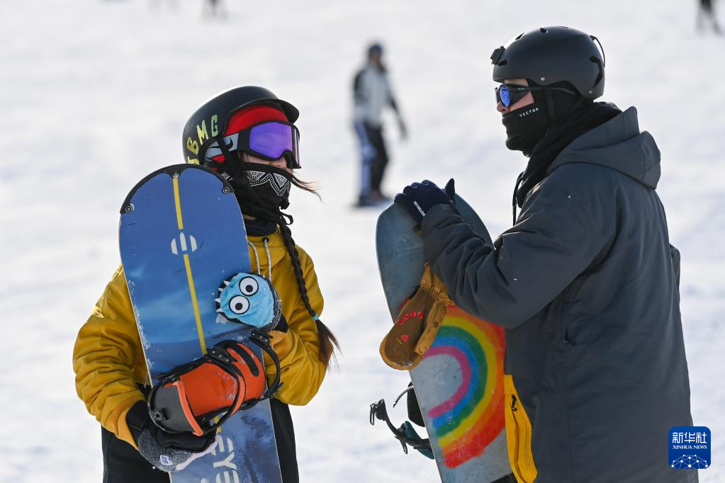 5日、新疆シルクロード国際リゾートで言葉を交わすスノーボード愛好者ら。(ウルムチ=新華社記者/丁磊)