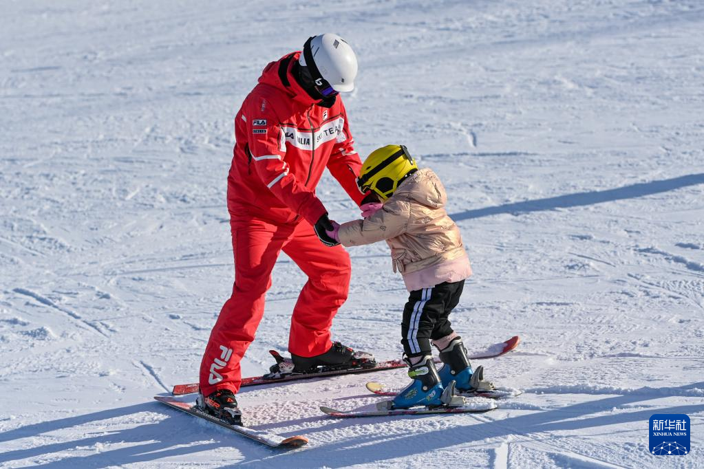 5日、新疆シルクロード国際リゾートでスキーの指導を受ける子ども。(ウルムチ=新華社記者/丁磊)pagebreak