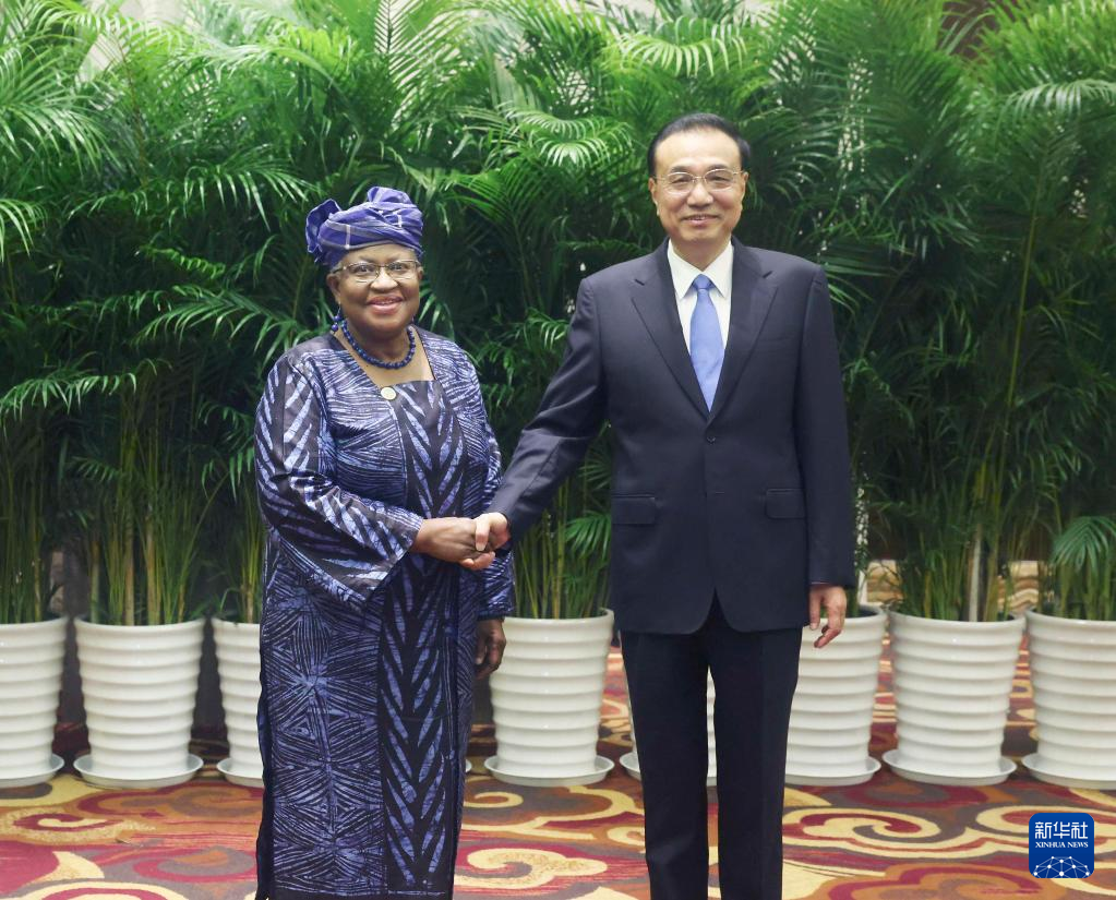 中国の李克強(り・こくきょう)国務院総理は8日午後、第7回「1+6」円卓対話出席のため中国を訪問中の世界貿易機関(WTO)のオコンジョイウェアラ事務局長と安徽省黄山市で会見した。(合肥=新華社記者/劉衛兵)