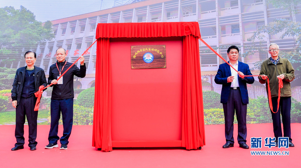 10日、開幕式で海峡両岸家風家譜研究センターのプレート除幕を行う関係者。(アモイ=新華社記者/劉黙涵)