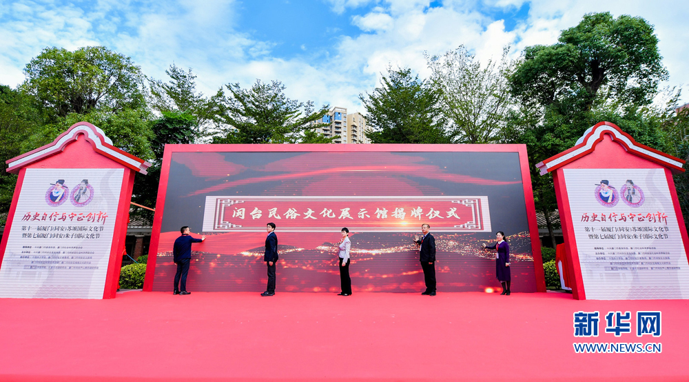 10日、開幕式で閩台民俗文化展示館の除幕式を行う主催者。(アモイ=新華社記者/劉黙涵)