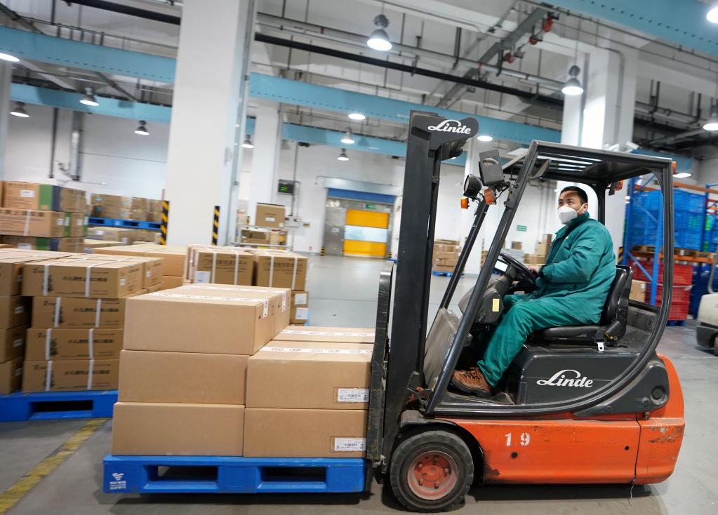 20日、国薬集団医薬物流の上海物流センター2号倉庫で、フォークリフトを運転して医薬品を運搬する従業員。(上海=新華社記者/劉穎)