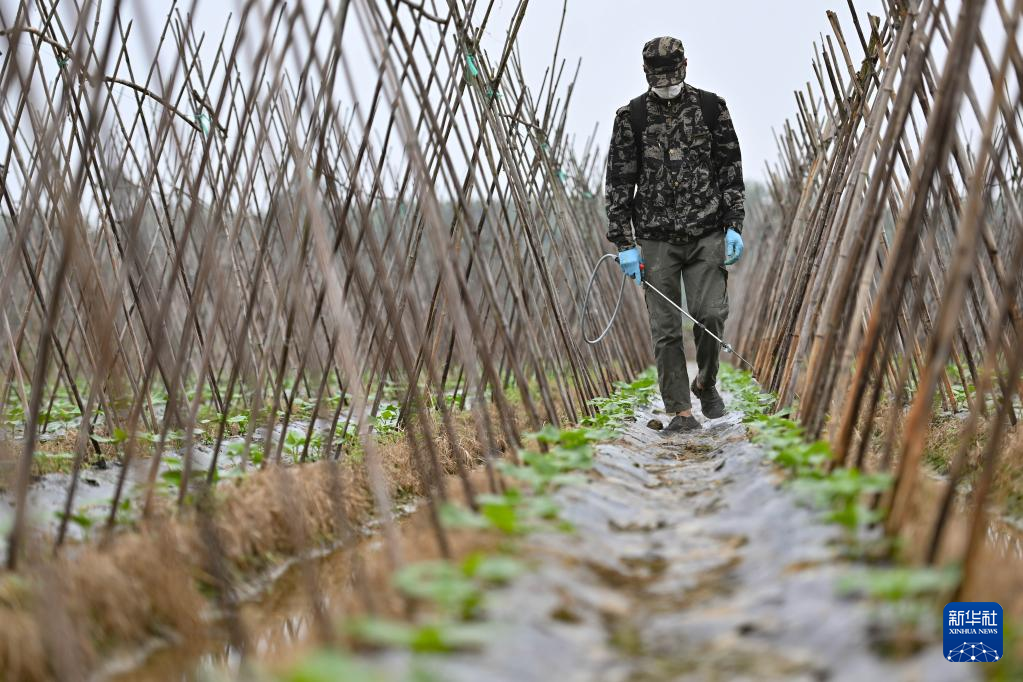 5日、海南省澄邁県の金安農場でキュウリの苗に農薬を散布する農家の人。(澄邁=新華社記者/郭程)