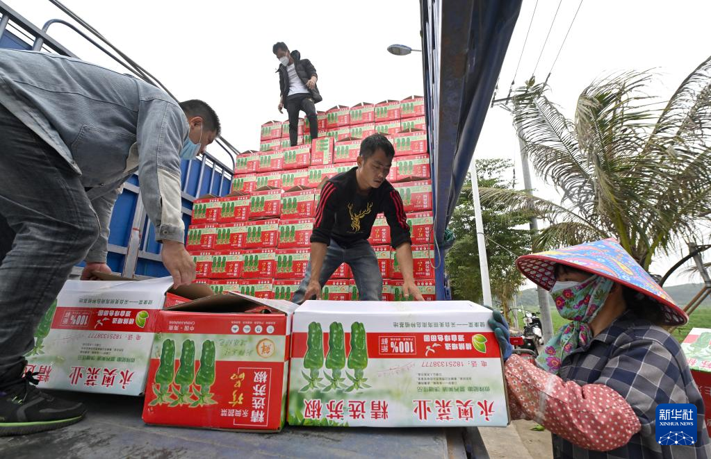 5日、海南省澄邁県の金安農場で、省外に出荷するトウガラシをトラックに積む従業員。(澄邁=新華社記者/郭程)