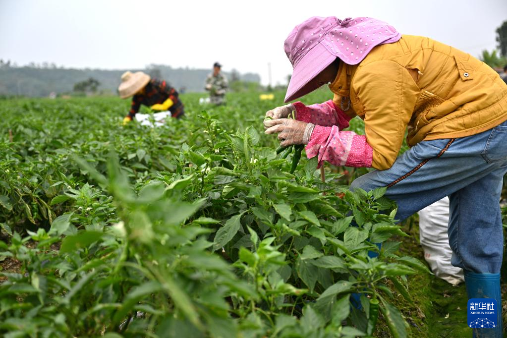 5日、海南省澄邁県の金安農場でトウガラシを収穫する農家の人。(澄邁=新華社記者/郭程)pagebreak