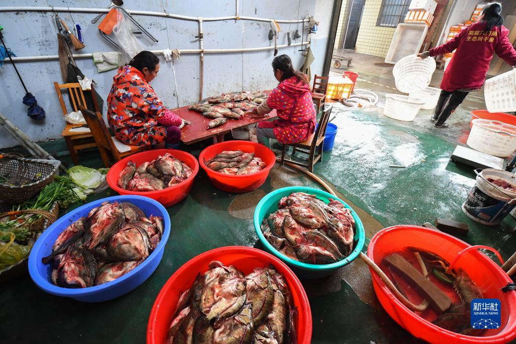 12日、岳陽市君山区銭糧湖鎮六門閘社区の漁村で、魚をさばく住民。(岳陽=新華社記者/陳沢国)pagebreak