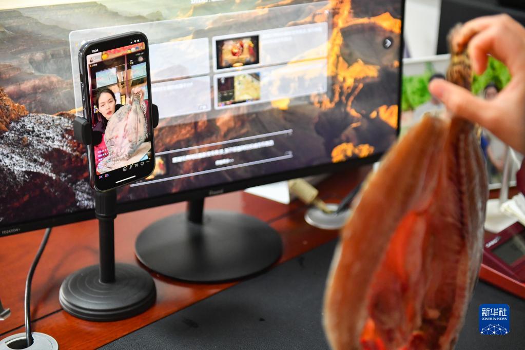 13日、岳陽市君山区銭糧湖鎮六門閘社区の漁村で、干物をライブ配信で販売する住民。(岳陽=新華社記者/陳沢国)pagebreak