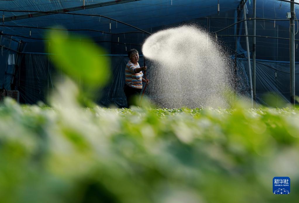7日、灤州市小馬荘鎮にある野菜専門合作社(協同組合)で野菜の苗に水をやる従業員。(唐山=新華社記者/楊世尭)pagebreak