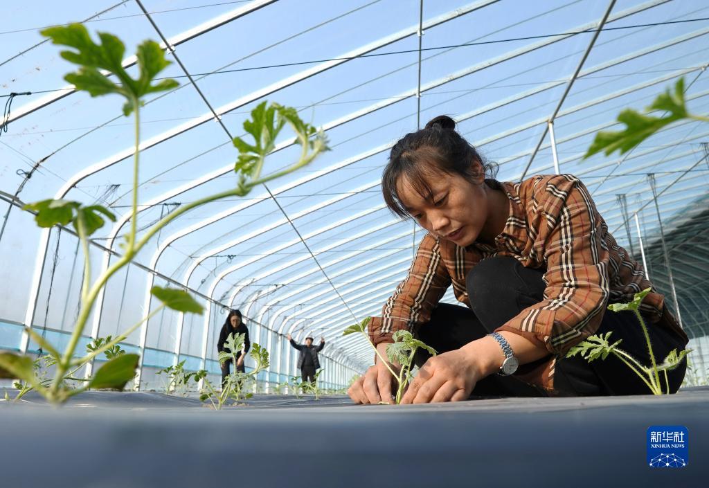 7日、灤州市灤城街道楊家院村にあるハウスでスイカの苗を管理する農家の人。(唐山=新華社記者/楊世尭)