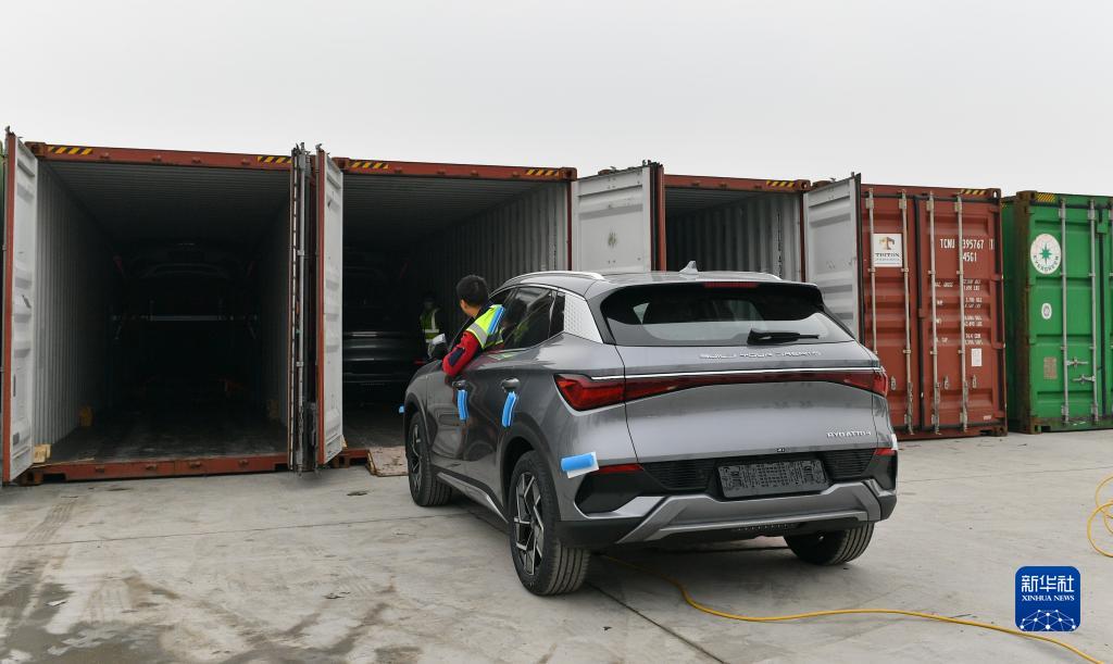 8日、コンテナに入る中国製新エネ車。(常州=新華社配信/史康)