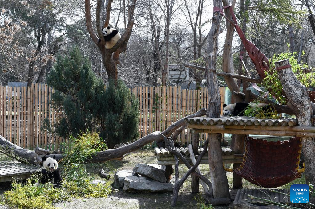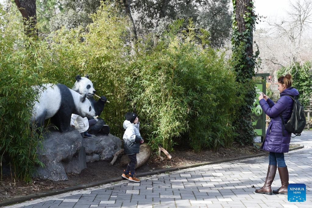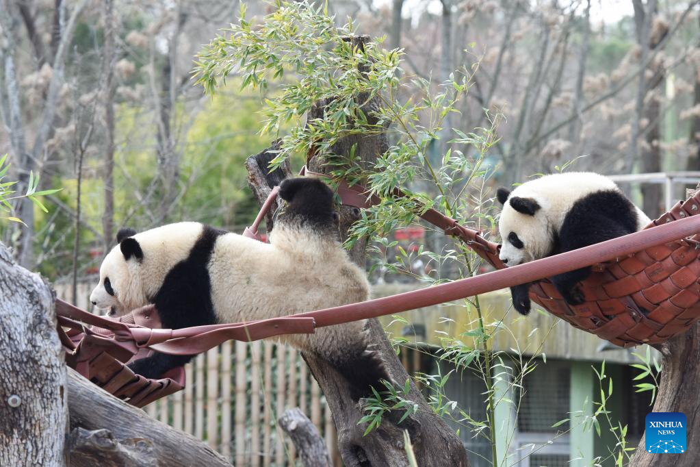 7日、マドリード動物園・水族館で遊ぶ友友と久久。(マドリード=新華社配信)