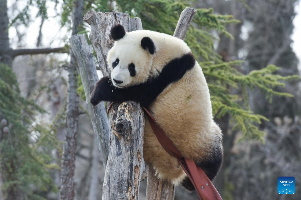 7日、マドリード動物園・水族館で遊ぶパンダ。(マドリード=新華社配信)pagebreak