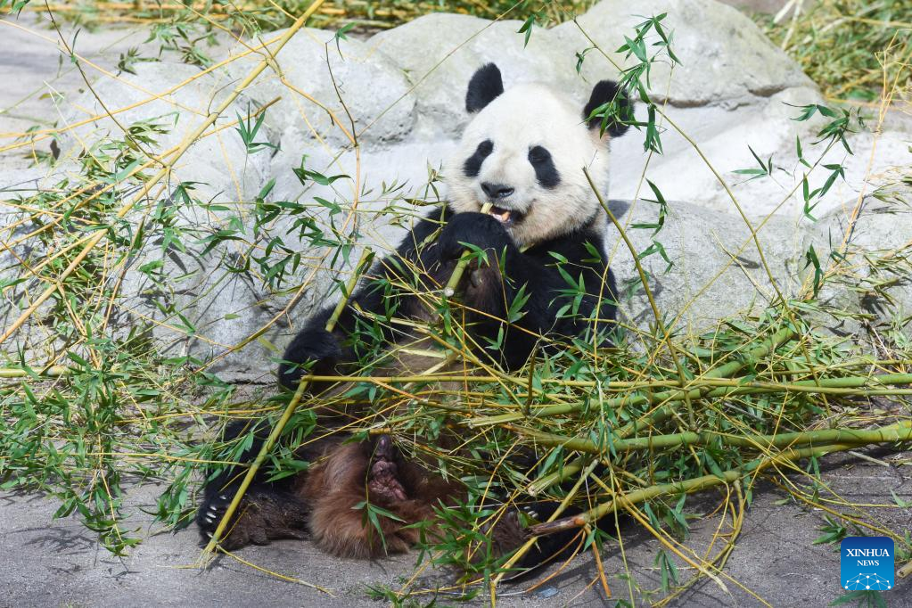 7日、マドリード動物園・水族館で竹を食べる氷星。(マドリード=新華社配信)pagebreak