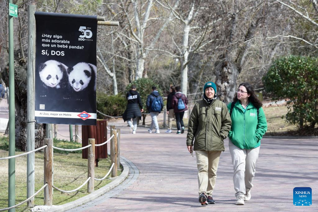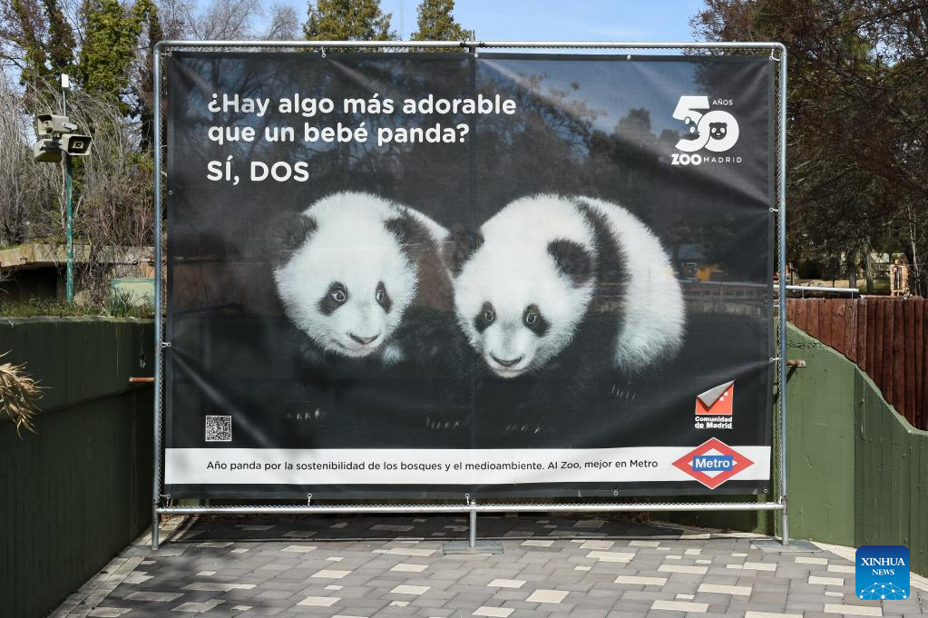 7日、マドリード動物園・水族館の双子パンダをPRするバナースタンド。(マドリード=新華社配信)