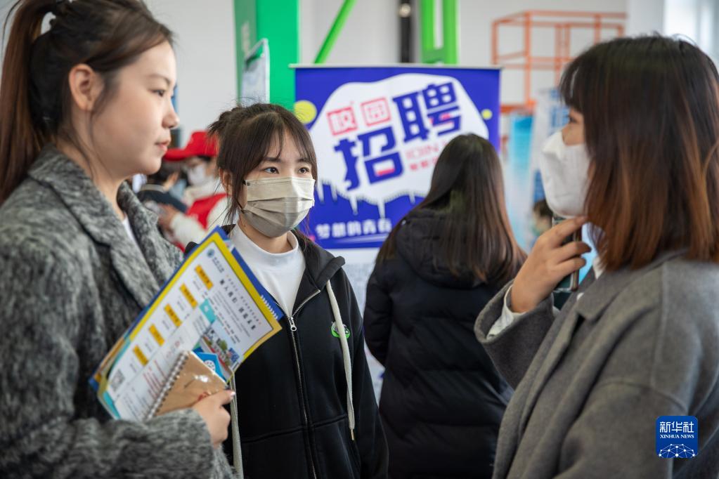 8日、就職説明会で採用担当者と話す求職者。(ハルビン=新華社記者/張濤)