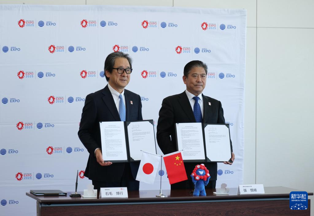 大阪・関西万博中国パビリオンの政府総代表を務める中国国際貿易促進委員会の張慎峰(ちょう・しんほう)副会長と2025年日本国際博覧会協会の石毛博行事務総長が、それぞれ中日双方を代表して参加契約書に署名した。