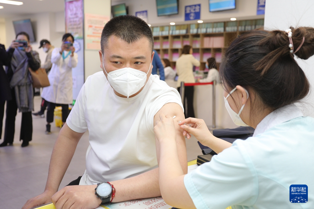 帯状疱疹のワクチン接種を受ける長春市在住の崔鑫さん。(4月20日撮影、長春=新華社配信)
