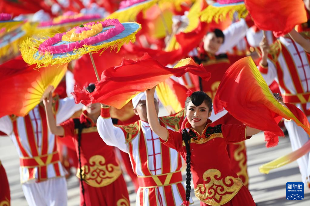 中国・中央アジアサミットに出席するトルクメニスタンのベルドイムハメドフ大統領が18日午前、陝西省西安市に到着した。写真は民間舞踊でベルドイムハメドフ大統領を歓迎する地元の人々。(西安=新華社記者/邢広利)