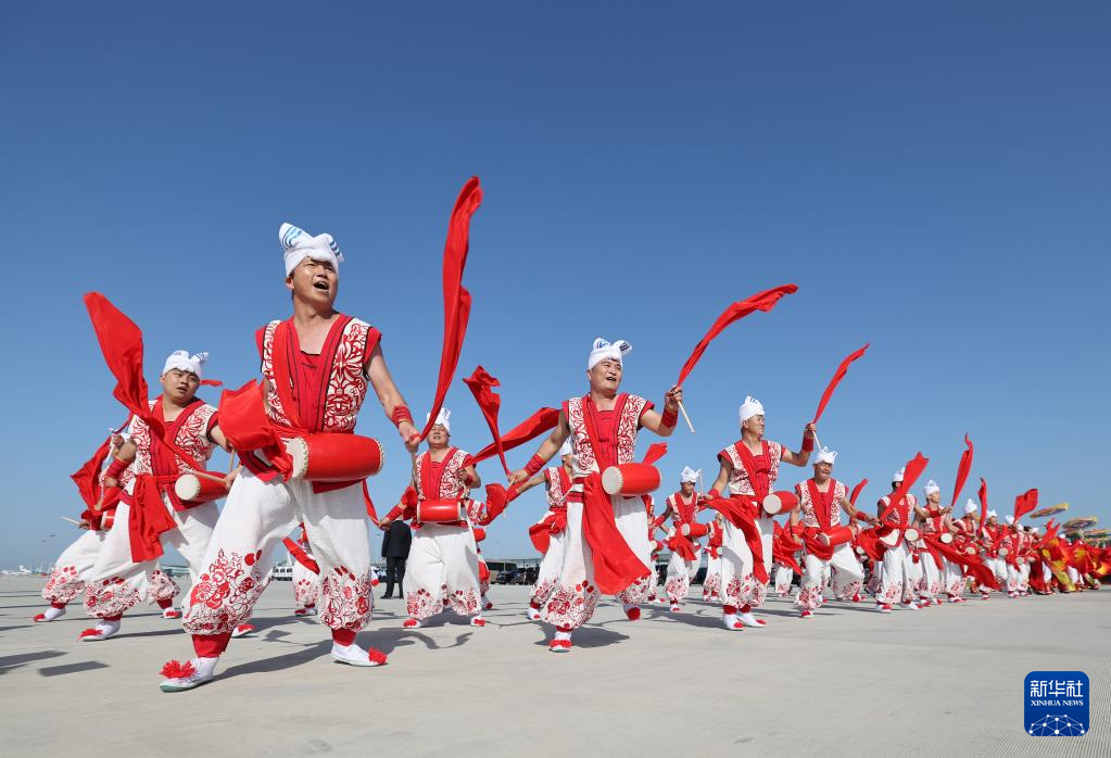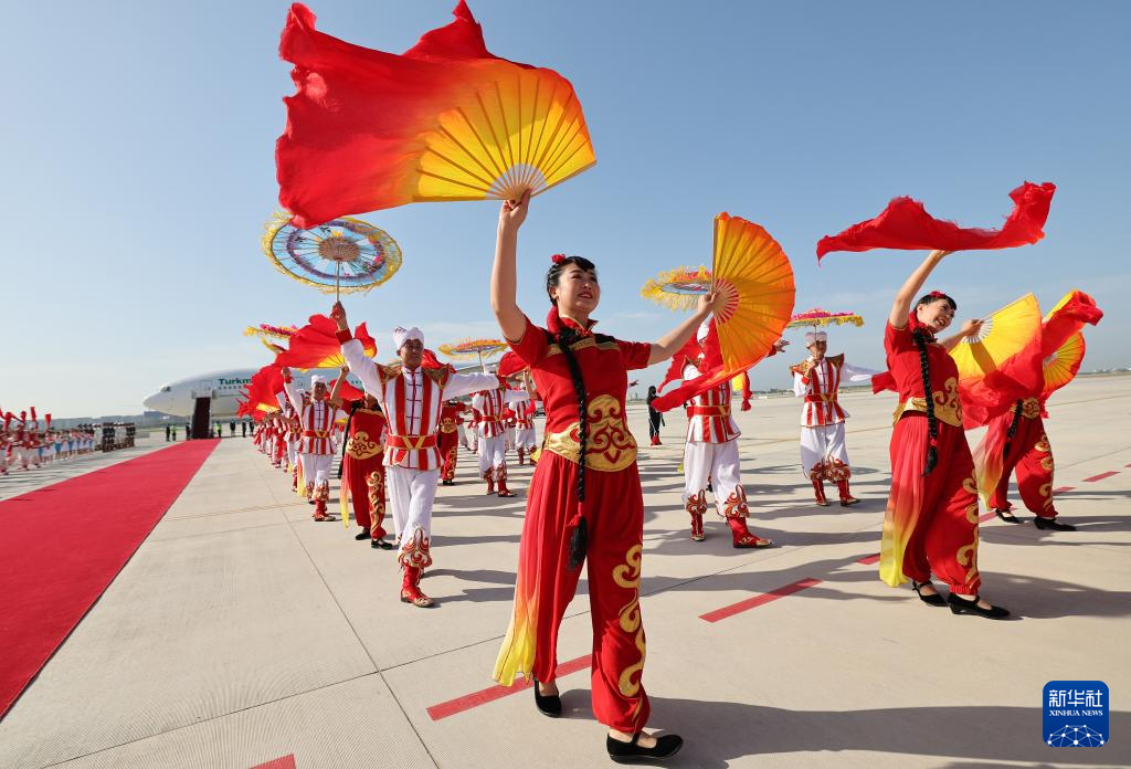 中国・中央アジアサミットに出席するトルクメニスタンのベルドイムハメドフ大統領が18日午前、陝西省西安市に到着した。写真は民間舞踊でベルドイムハメドフ大統領を歓迎する地元の人々。(西安=新華社記者/李一博)