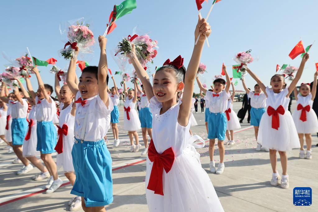 中国・中央アジアサミットに出席するトルクメニスタンのベルドイムハメドフ大統領が18日午前、陝西省西安市に到着した。写真はベルドイムハメドフ大統領を歓迎する子どもたち。(西安=新華社記者/邢広利)