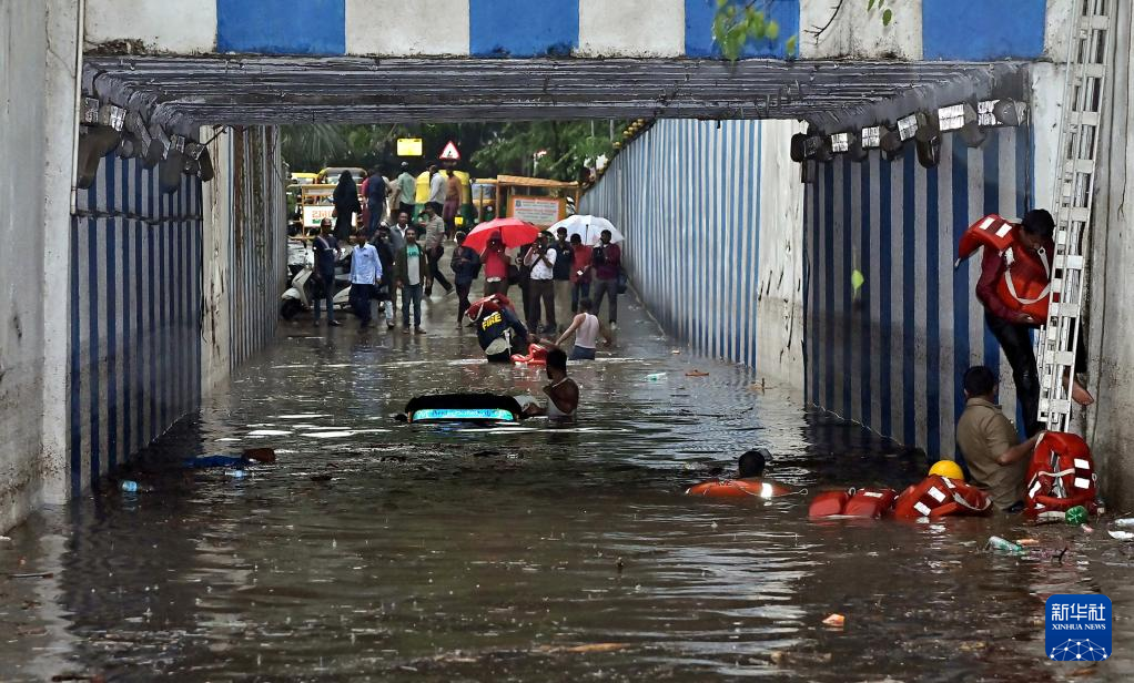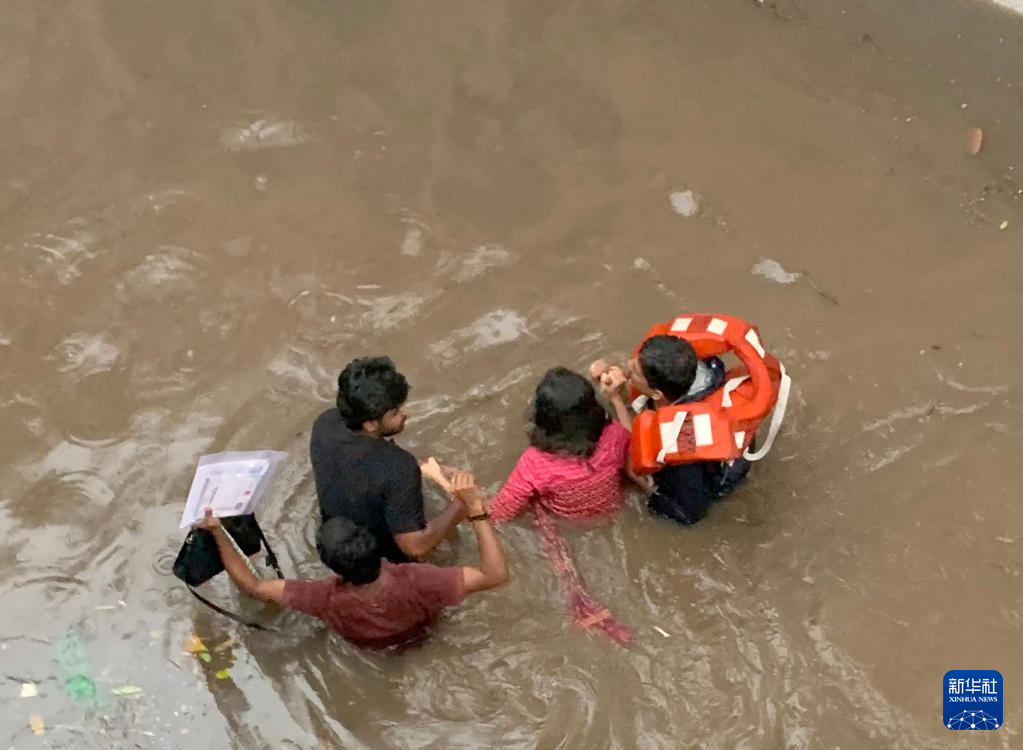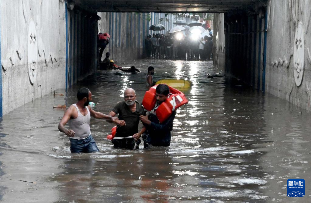 21日、ベンガルールの冠水したガード下通路で、人々を避難させる救助隊員。(ベンガルール=新華社配信)
