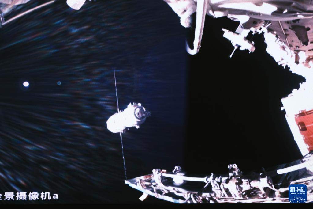 30日、北京航天飛行制御センターのモニターに映し出された、「神舟16号」と「天和」のドッキングの様子。(北京=新華社記者/李傑)