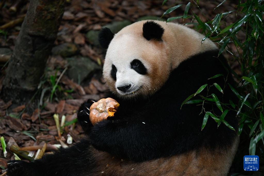 29日、カボチャを食べる「梅蘭」。(成都=新華社記者/胥冰潔)