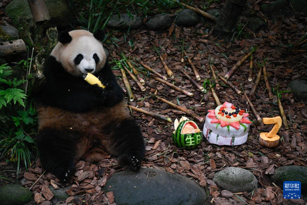 【新華社成都5月31日】中国四川省の成都ジャイアントパンダ繁殖研究基地・都江堰野生化研究センターで29日、雌のパンダ「梅蘭(メイラン)」が7歳の誕生日を迎え、ごちそうをプレゼントされた。pagebreak