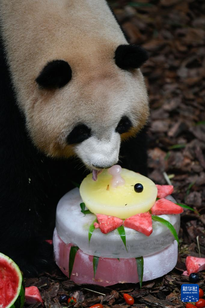 29日、飼育員が用意したアイスケーキを味わう「梅蘭」。(成都=新華社記者/胥冰潔)pagebreak