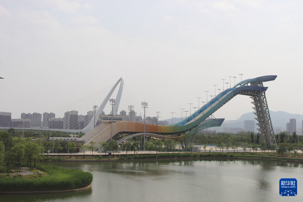 29日、首鋼スキージャンプ台の北西側にある冬季五輪のモニュメント「冬季五輪リンク」。(北京=新華社記者/李佼俐)pagebreak