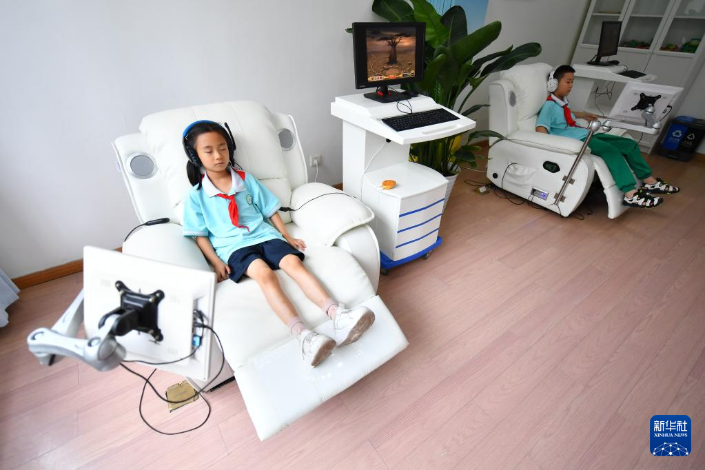 5月31日、長沙市岳麓区実験小学校の「心語花渓」心理成長センターで、音楽を聴いてリラックスする児童。(長沙=新華社記者/陳沢国)pagebreak